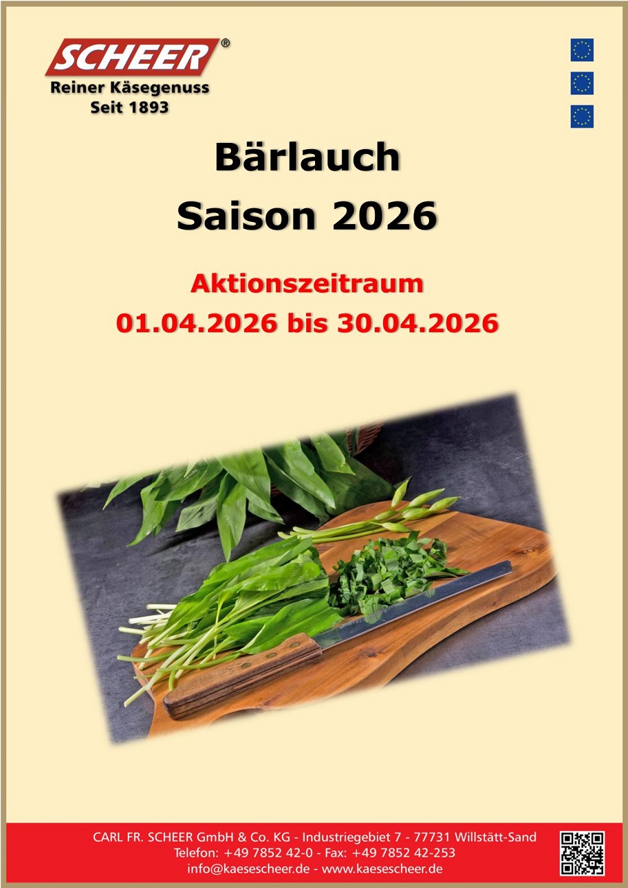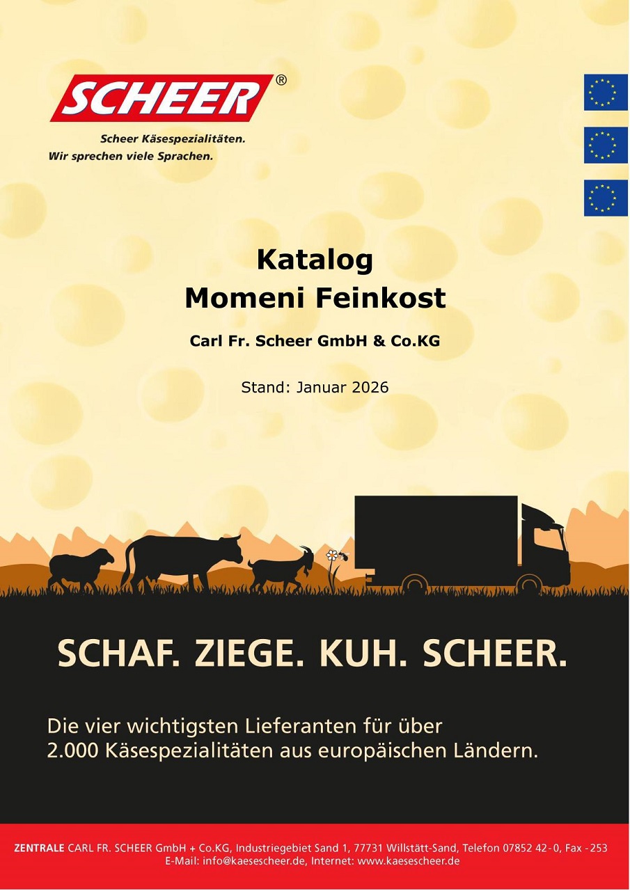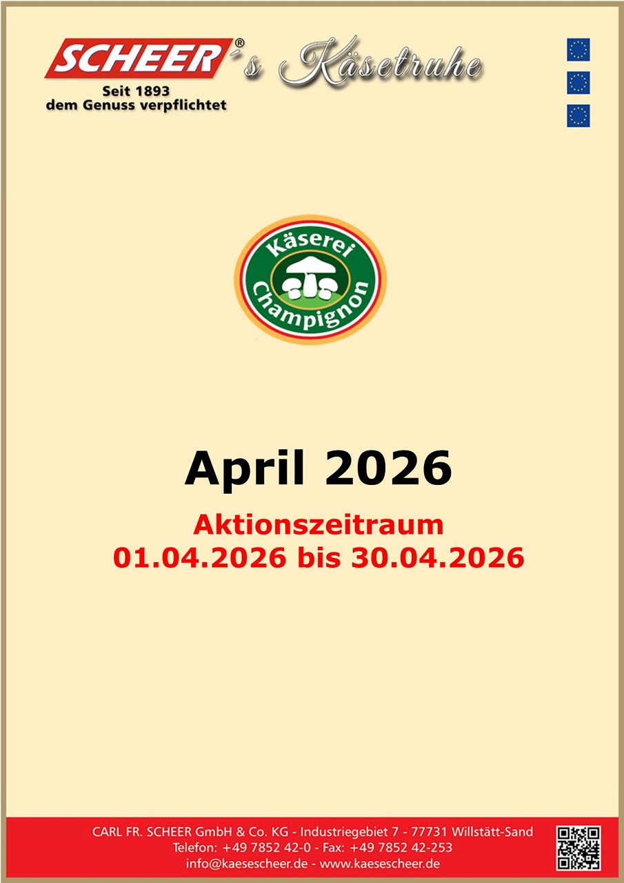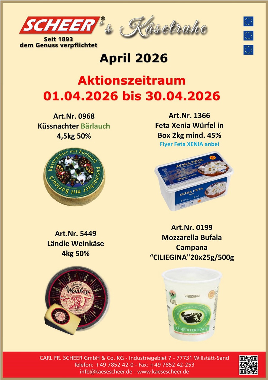 Unsere internationalen Käsespezialitäten bieten wir als Monatsaktionen unter dem Motto „Scheer’s Käsetruhe“ mit jeweils wechselnden Aktionsartikel an. Darüber hinaus können zusätzliche Aktionsartikel von ausgewählten Markenlieferanten im monatlichen Wechsel geordert werden.
